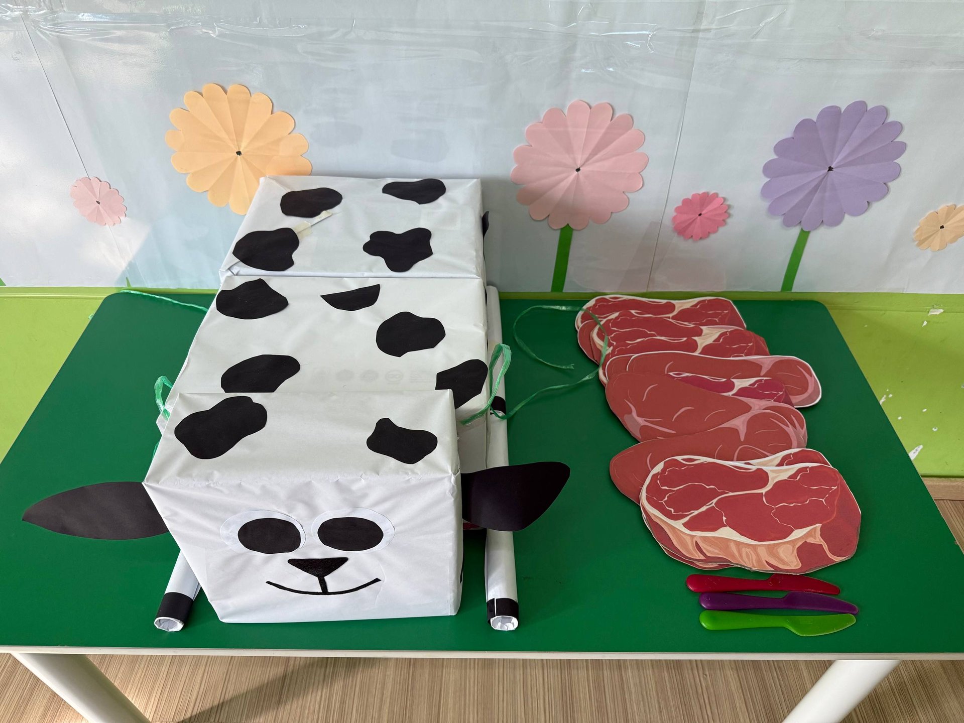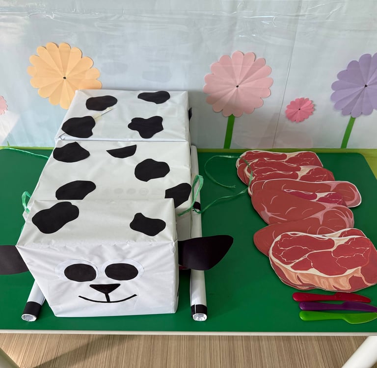 To make the lesson engaging and easy to grasp, the school prepared a special setup using paper and cardboard materials. There were model cows, paper-cut pieces of meat, and even a cardboard weighing scale, all thoughtfully created to resemble the real Qorban process.