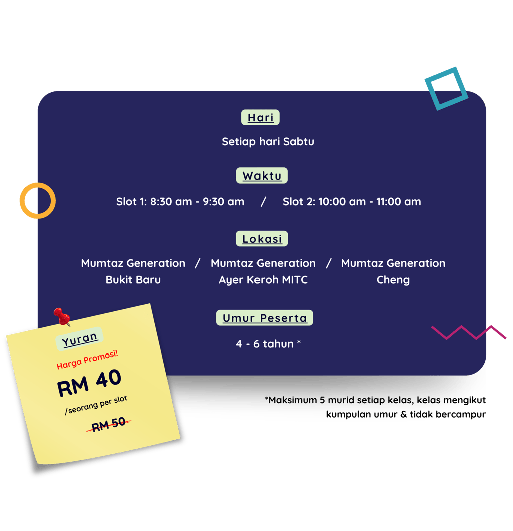 Tempat adalah terhad, hanya 5 murid untuk satu kelas mengikut kumpulan umur. Pendaftaran awal memastikan anak anda dapat slot yang sesuai.