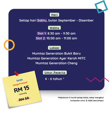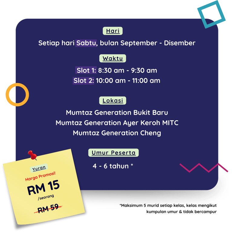 Tempat adalah terhad, hanya 5 murid untuk satu kelas mengikut kumpulan umur. Pendaftaran awal memastikan anak anda dapat slot yang sesuai.